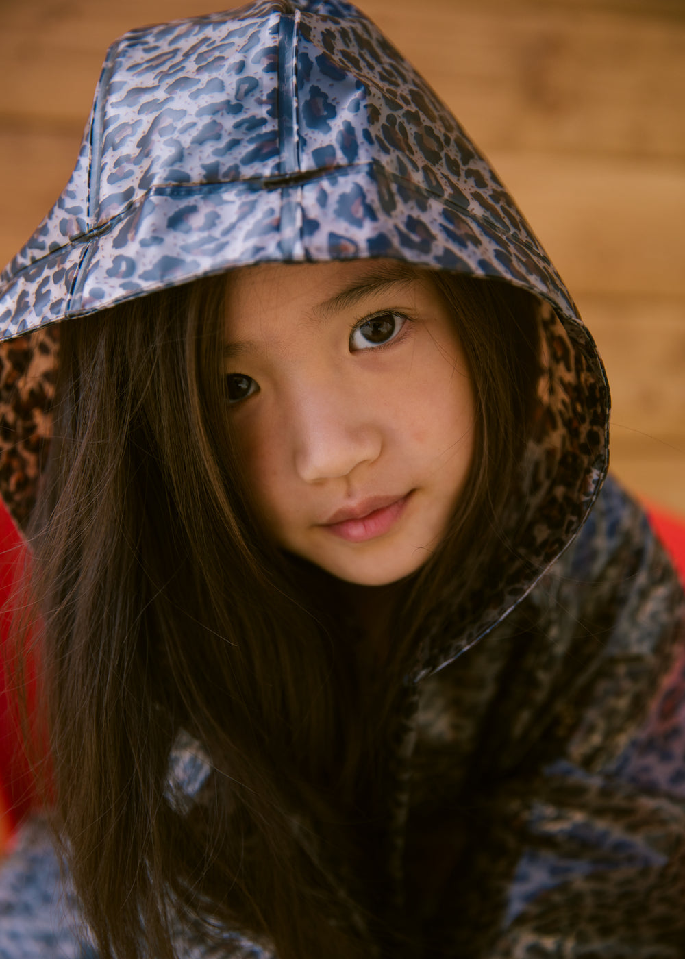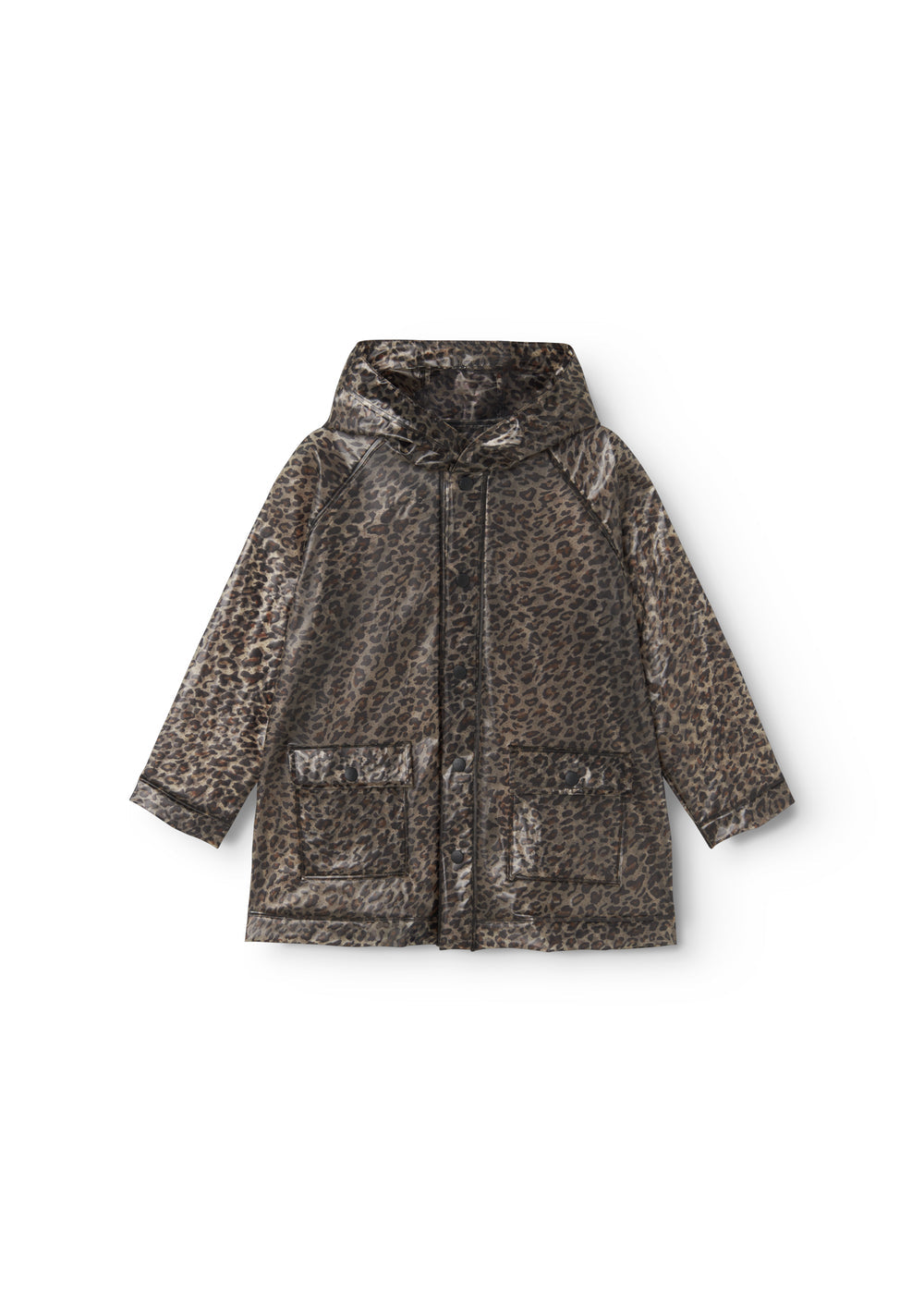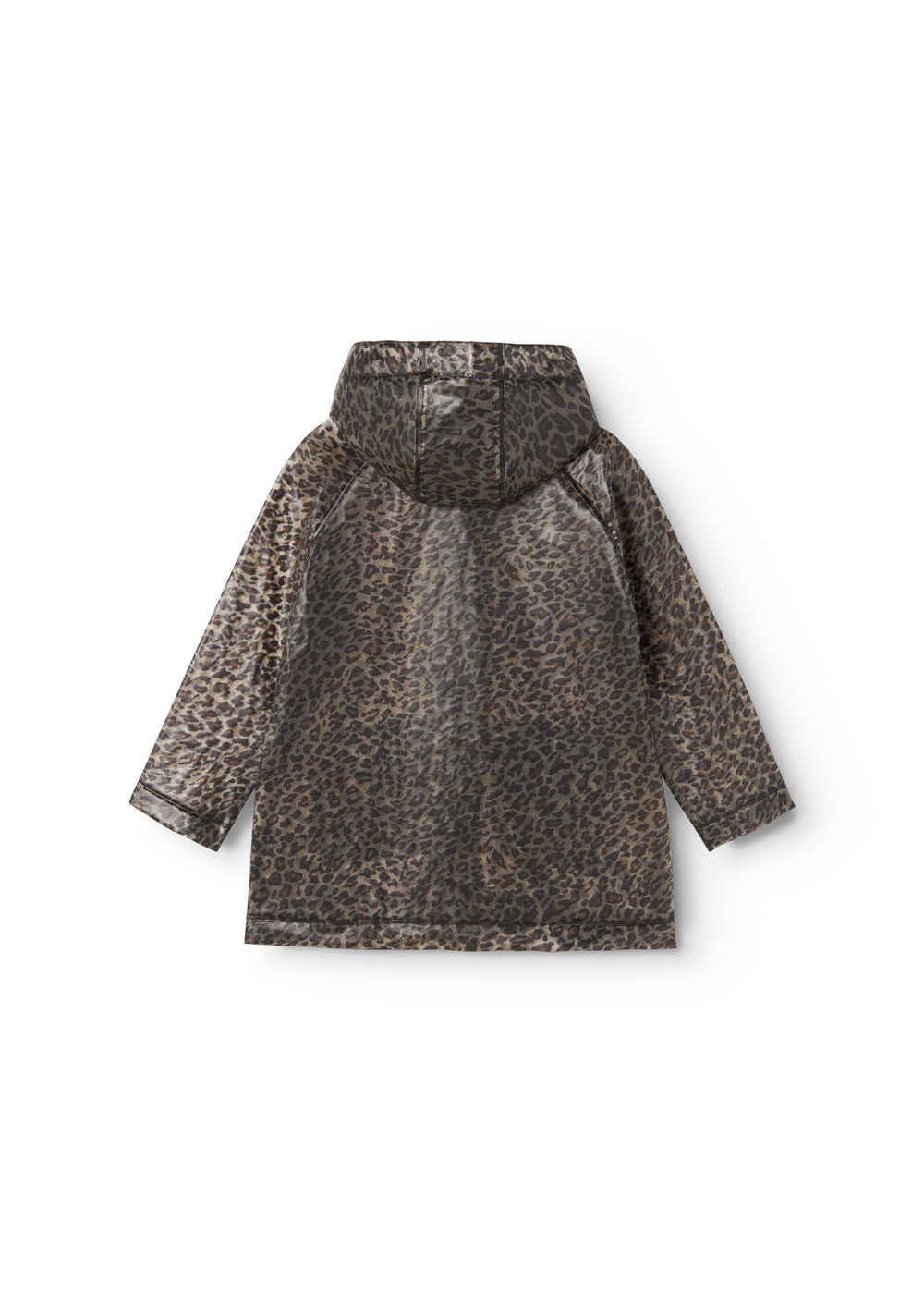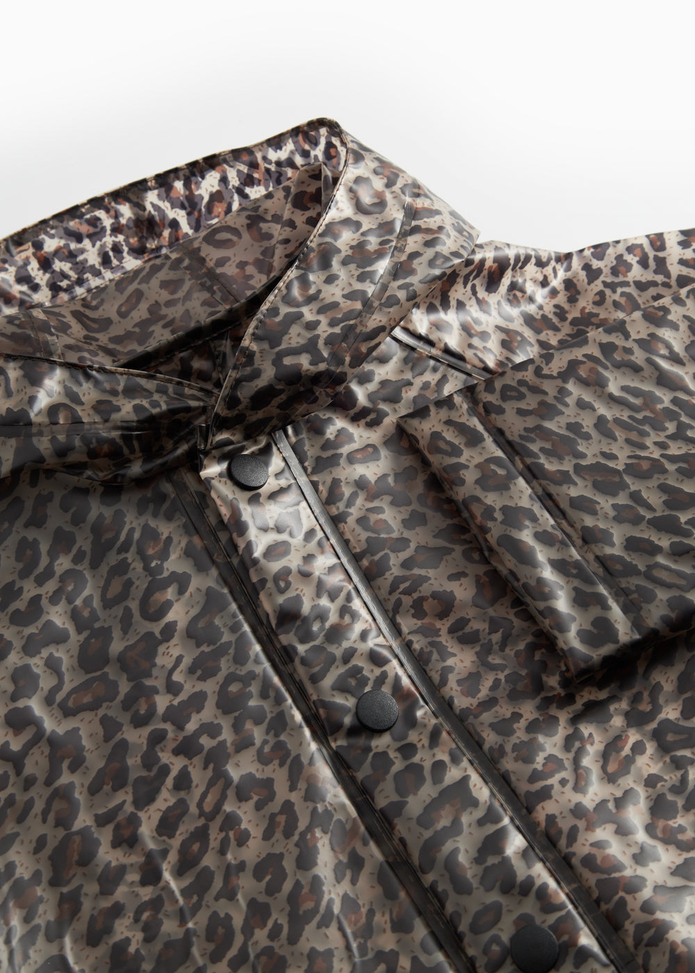 מעיל גשם שקוף בהדפס נמר עם כובע, סגירת לחצנים ושני כיסים גדולים בחזית. המעיל עמיד במים ויש לו לחץ עמוד מים של 10,000 מ”מ