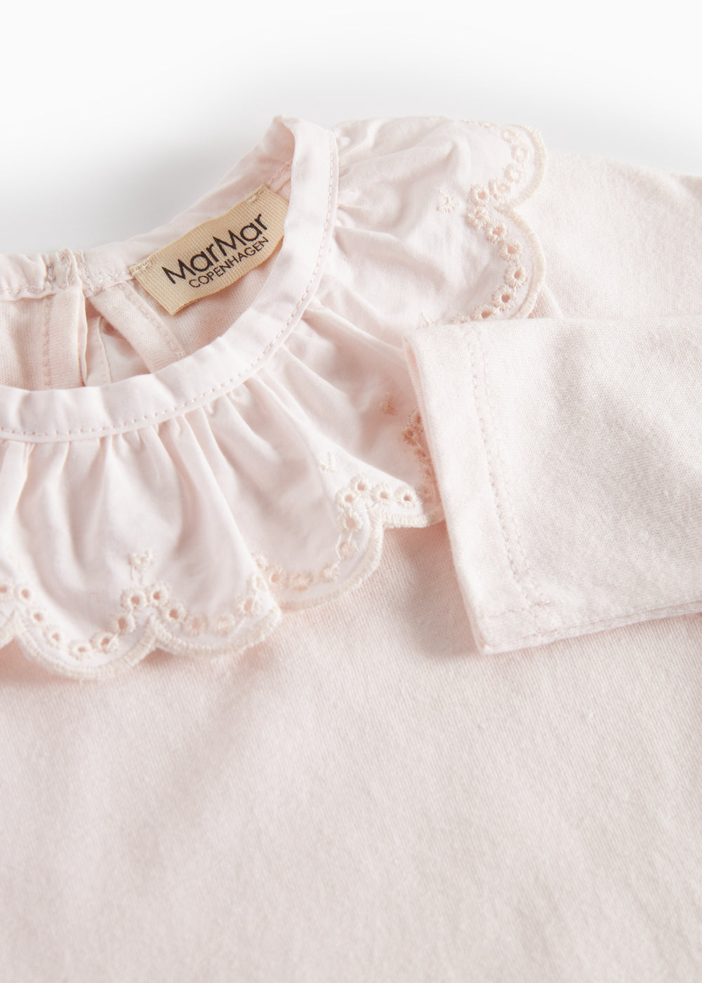 בגד גוף לתינוק עם שרוולים ארוכים עם צווארון חמוד והדפס פרחים חמוד. בגד הגוף נסגר עם כפתורי הצמד מאחור ובמפשעה להחלפה קלה. בגד הגוף רך, נמתח ונוח ללבישה