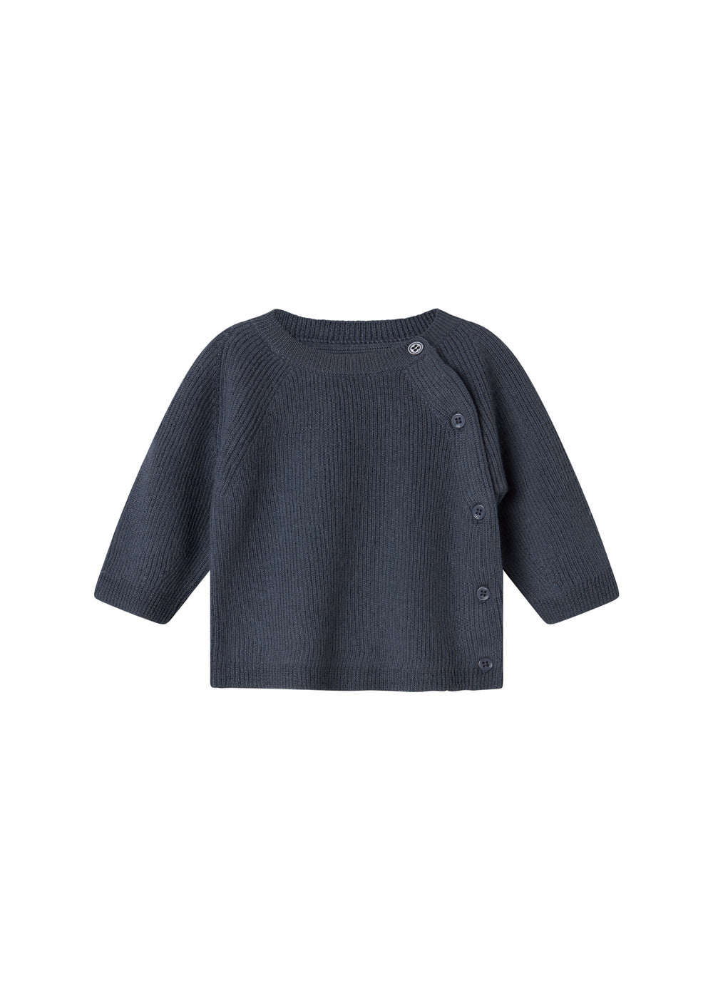 סוודר סרוג מצמר מרינו לקטנטנים, עם שרוולי רגלאן וסגירת כפתורים בצד שמאל. הסוודר חמים, רך ונוח ללבישה.