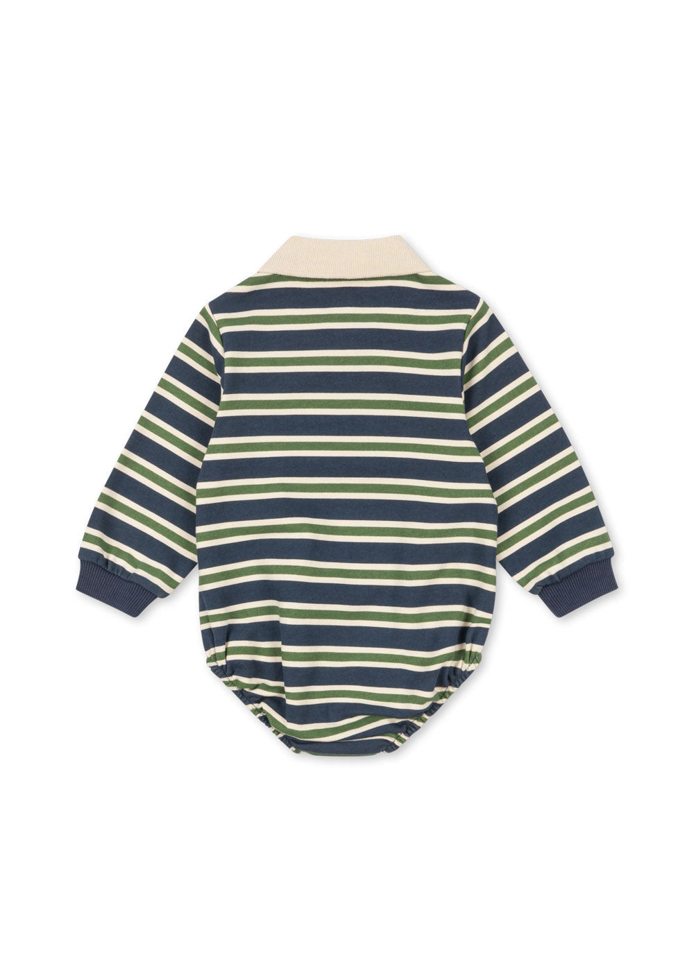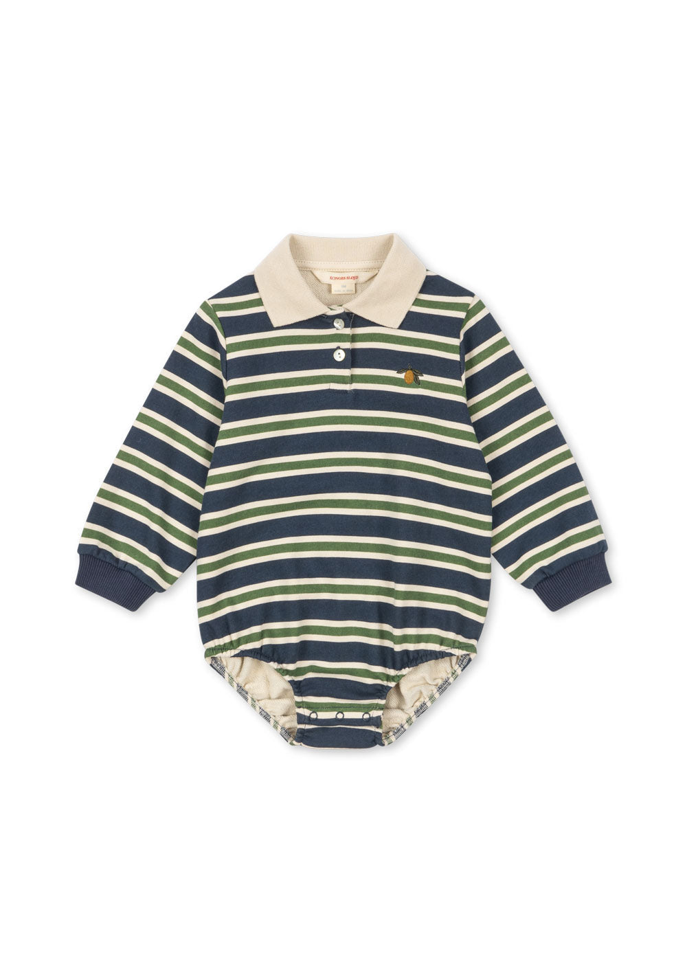רומפר כותנה רכה בעיצוב פולו קלאסי. כולל צווארון רגיל, חפתים עם כפתורים וחיבור בכפתורים באזור הרגליים לנעילה נוחה.