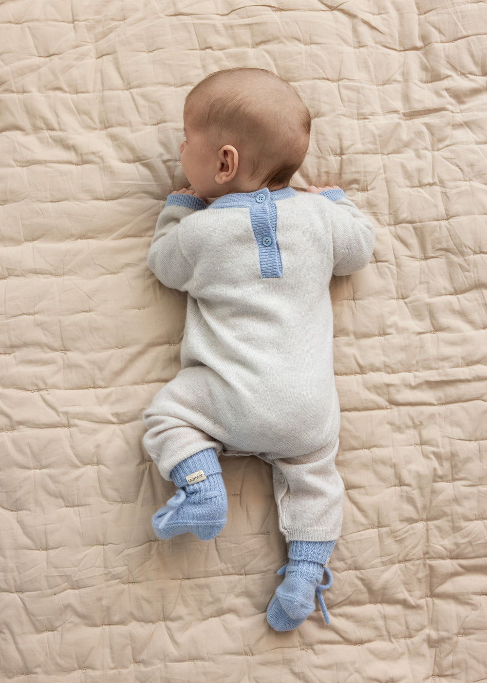 חליפת קשמיר לקטנטנים עם סגירת כפתורים בגב ובין הרגליים להחלפה נוחה.