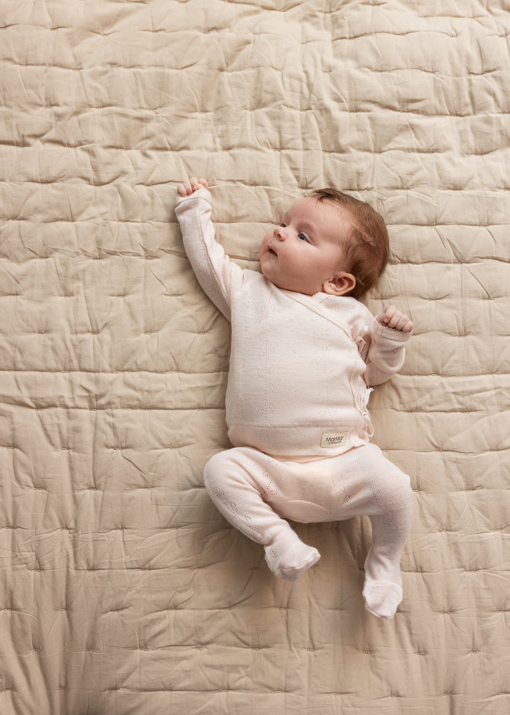 Body suit for new borns with feet in. Soft varm wool quality and good fit.