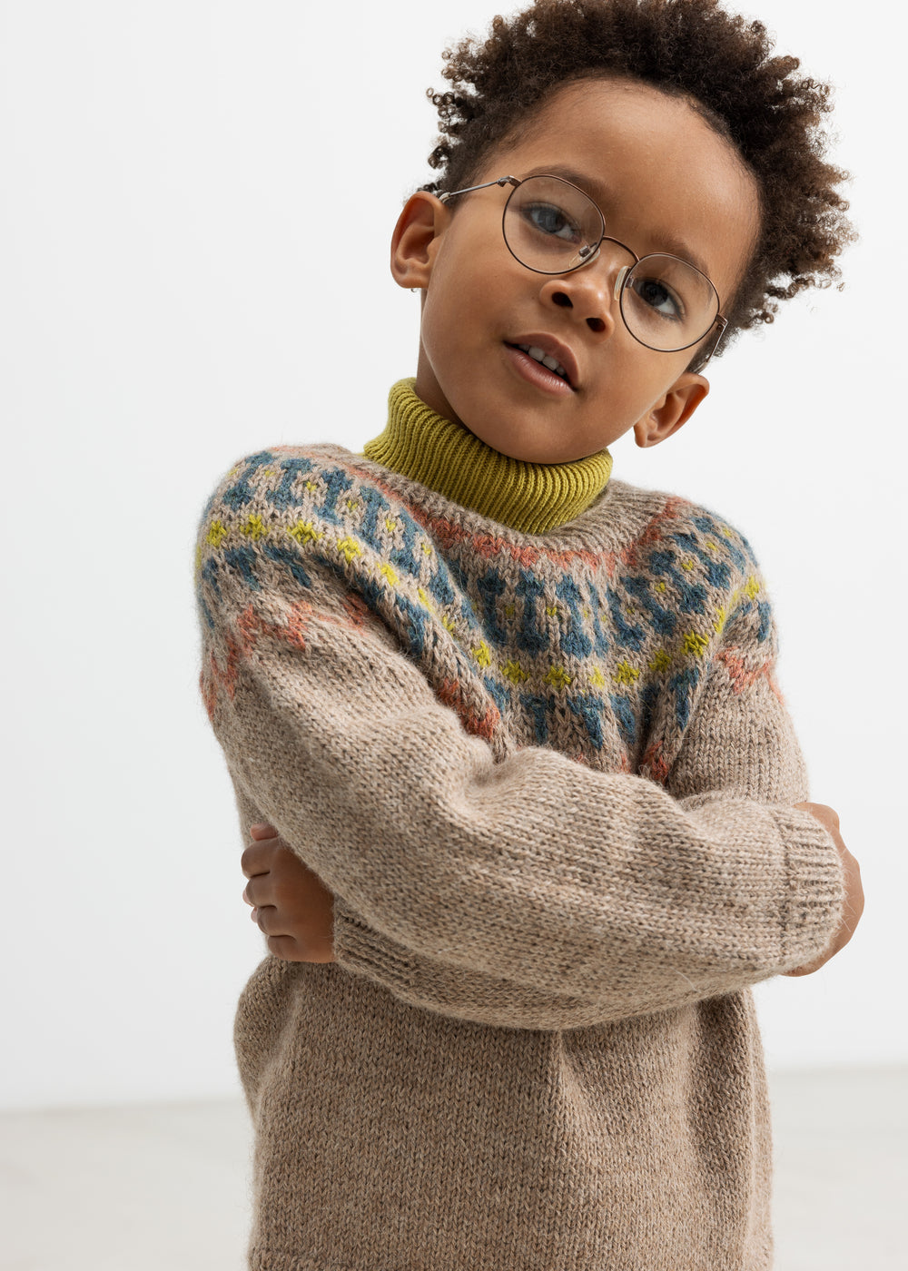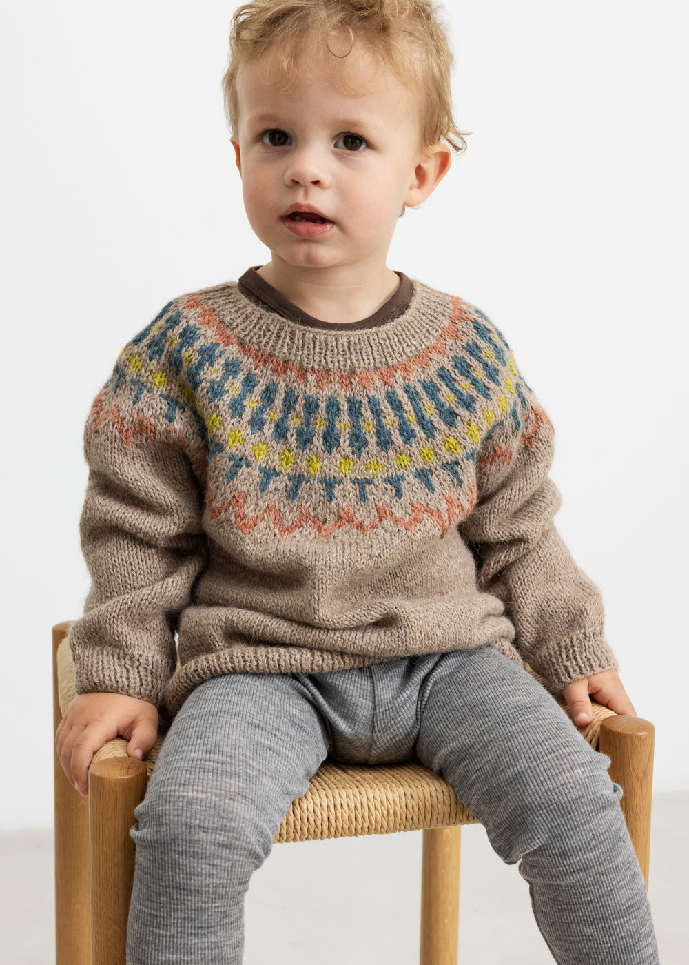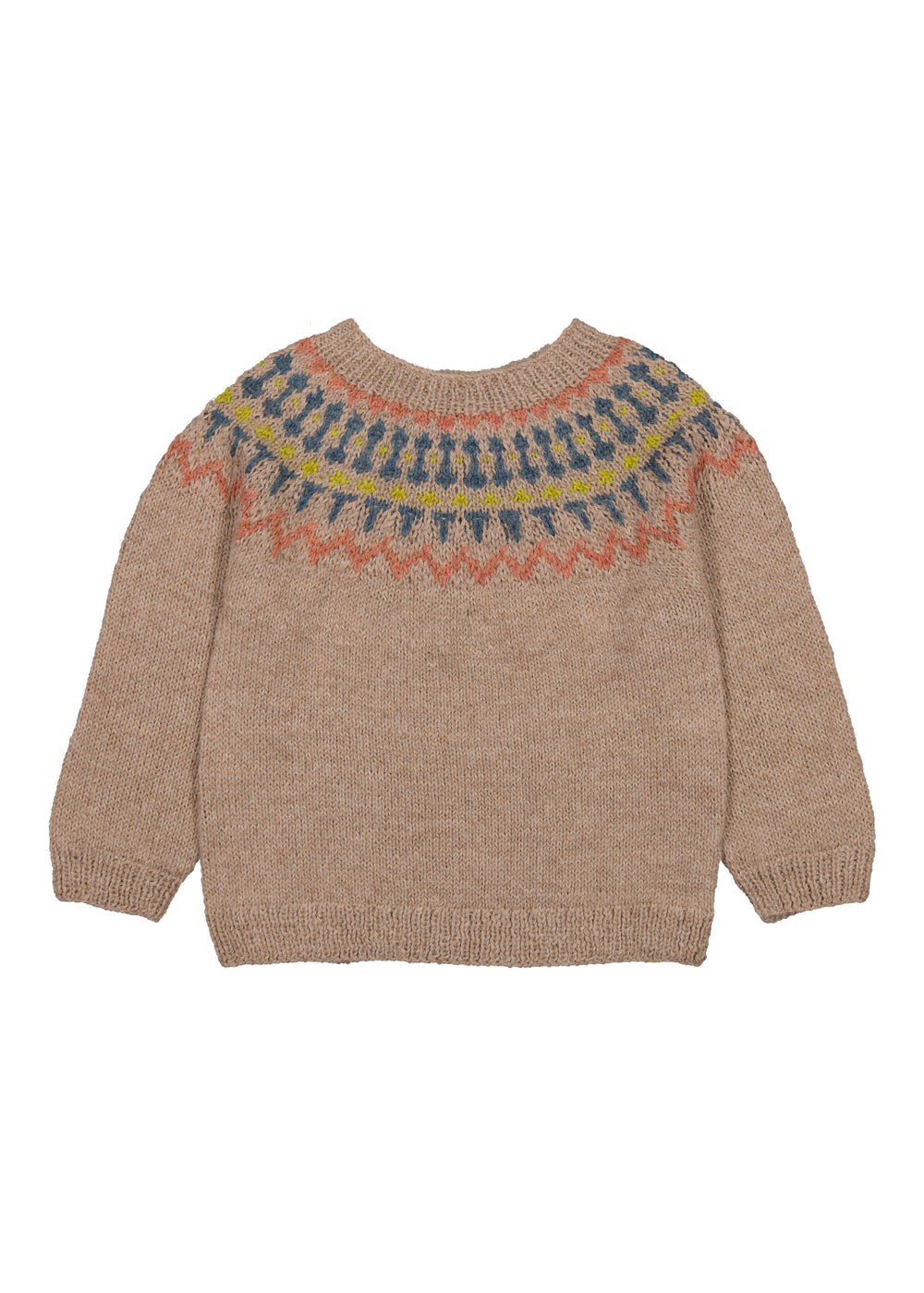 סוודר אלפקה סרוג בעבודת יד עם דוגמה יפהפייה לקטנטנים. הסוודר נסרג בעבודת יד על ידי נשים איימרה – ילידות הרי האנדים שבבוליביה. כל פריט הוא ייחודי לחלוטין, שכן הוא מיוצר בעבודת יד על ידי נשים שונות.